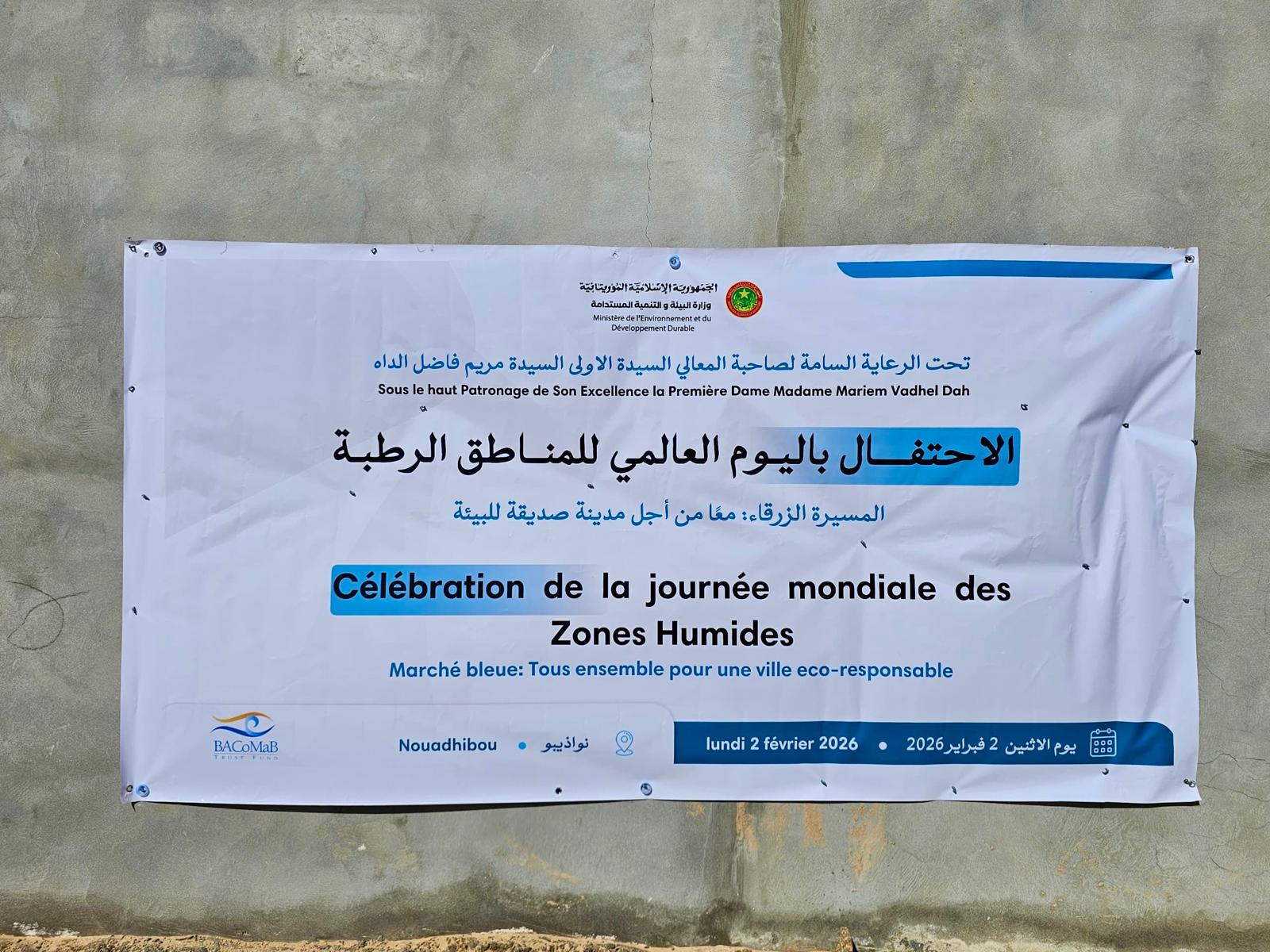À l’occasion de la Journée mondiale des zones humides 2026, une Marche Bleue s’est tenue le 2 février à Nouadhibou, sous le Haut Patronage de Son Excellence Madame Mariem Vadhel Dah. Cette initiative a réuni habitants, associations et partenaires locaux autour d’un double objectif : sensibiliser le public à l’importance des zones humides et participer concrètement à leur préservation par le ramassage de déchets.